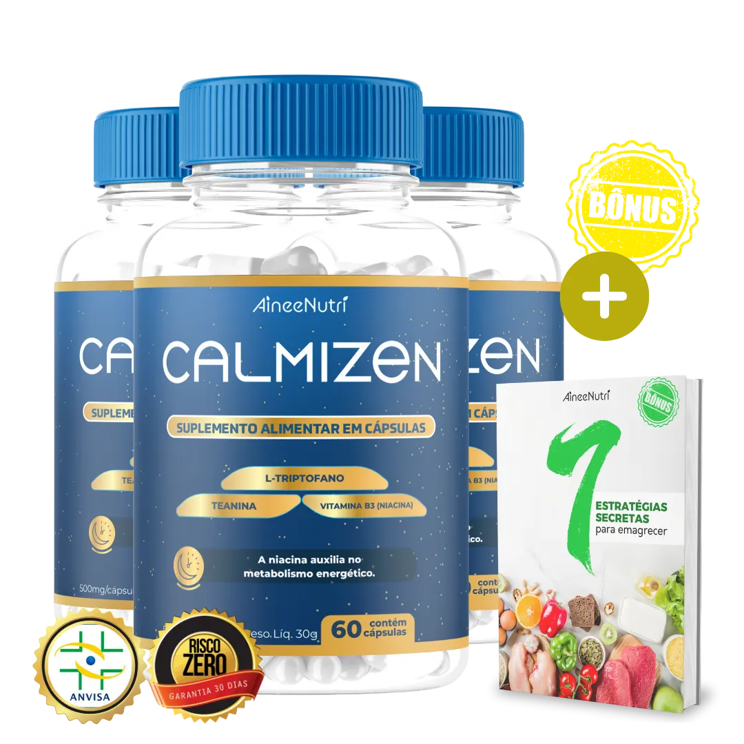 O Calmizen é um suplemento natural que ajuda a reduzir a ansiedade, melhorar a qualidade do sono e promover o equilíbrio emocional. Ele contém L-Triptofano, Teanina e Vitamina B3, ingredientes eficazes para aliviar o estresse e proporcionar bem-estar, sem causar sonolência durante o dia.
